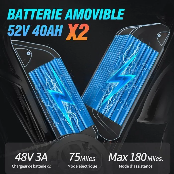 2000 W variklis suteikia stiprią trauką, leidžiančią lengvai įveikti įkalnes ir važiuoti didesniu greičiu. Talpi 52 V / 40 Ah išimama baterija leidžia nuvažiuoti 80–120 km vienu įkrovimu (priklausomai nuo važiavimo režimo, reljefo ir apkrovos), todėl dviratis puikiai tinka tiek kasdienėms kelionėms, tiek ilgoms išvykoms.