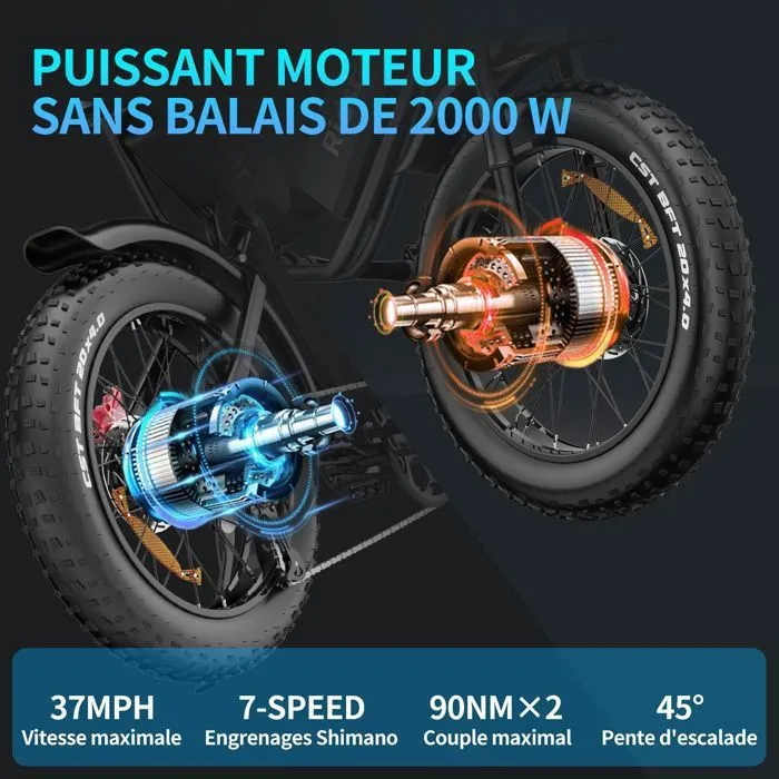 Elektrinis dviratis – 20″*4.0″ visureigių padangos – 2000 W variklis – išimama 52 V / 40 Ah baterija – nuvažiuojamas atstumas 80–120 km – „Shimano“ 7 pavaros – juodos spalvos.