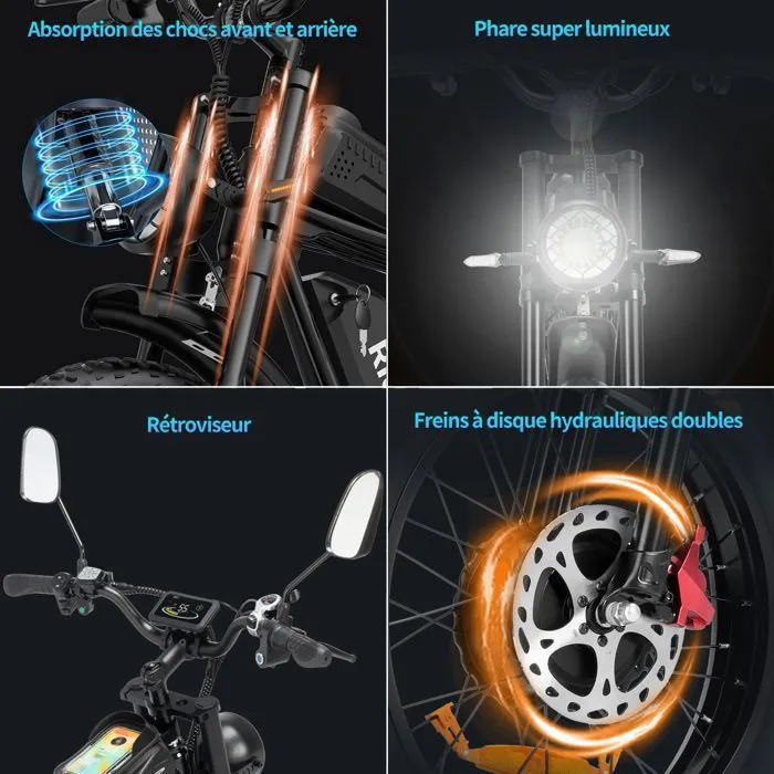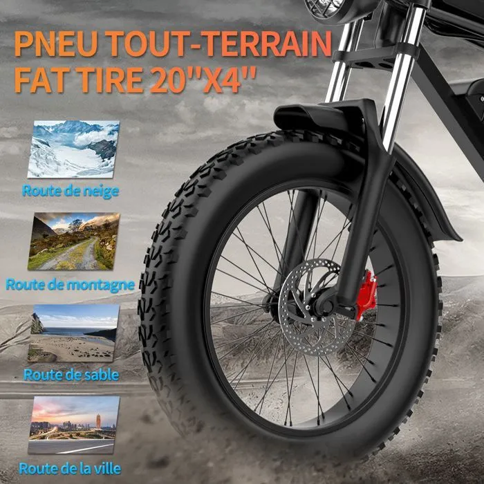 Šis 20″*4.0″ elektrinis dviratis sukurtas aktyviems dviratininkams, ieškantiems galingo, patikimo ir universalaus modelio. Plačios visureigių padangos suteikia puikų sukibimą ir stabilumą įvairiose kelio sąlygose – asfaltu, žvyru ar smėliu.