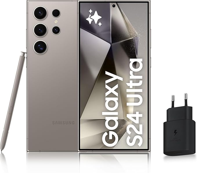 SAMSUNG Galaxy S24 Ultra – tai itin galingas ir pažangus Android 5G išmanusis telefonas, skirtas tiems, kas nori aukščiausios klasės našumo, profesionalių kamera galimybių, ilgai veikiančios baterijos ir futuristinio dizaino. Šis telefonas yra 512 GB vidinės atminties versija su 25 W greitu įkrovikliu komplekte, atrakintas (tinkamas naudoti su daugeliu tinklų) ir Amazon išskirtinis leidimas, siūlomas pilkos spalvos FR (Prancūzijos) versijoje – puikus pasirinkimas dirbantiems ar keliaujantiems tarptautiniu mastu.